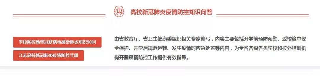 高校新冠肺炎疫情防控知识问答:提供疫情防控相关材料在线或下载学习,为高校开展疫情防控和师生实施个人防护提供有效指导。其中《学校防控新型冠状病毒感染肺炎知识50问》由南京医科大学编写,主要内容包括新冠肺炎相关知识,防护要求和返校注意事项等;《江苏高校新冠肺炎疫情防控手册》由省教育厅、省卫生健康委组织相关专家编写,主要内容包括开学前预防预警、返校途中安全保护、开学后规范运转、发生疫情时应急处置等。