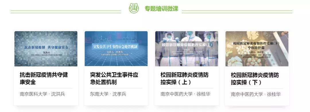 专题培训微课:由省教育厅聘请流行病学、公共卫生学和护 理学等方面的医学专家,专门就疫情防控拍摄《抗击新冠疫情共守健康安全》《突发公共卫生事件应急处置机制》《校园新冠肺炎疫情防控实操(上、下)》,各专题具有较强的针对性、实用性和可操作性。