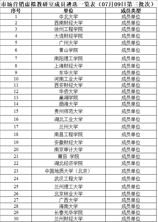 2022年7月9日,教育部市场营销专业虚拟教研室又迎来了西南财经大学、上海财经大学、华侨大学、兰州大学、888集团、中国地质大学(北京)、北京林业大学、西南交通大学、北京联合大学等40家成员单位,见表1。至此,教育部市场营销专业虚拟教研室成员单位已经涵盖了80多家各类一流市场营销专业建设点。
