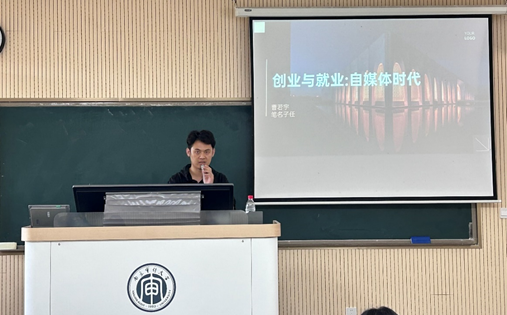 在三周的课程中,曹若宇以“创业与就业:自媒体时代”、“互联网文案的写作”、“短视频运营内容设计”为主题,进行了三场精彩讲座。在分享中,曹若宇将理论知识与实际案例有机结合,为学生们展示了众多成功的运营策略和创新的内容设计理念。他深入浅出地讲解了如何在自媒体时代进行有效的个人品牌建设和内容推广,帮助同学们掌握了当前行业的最新趋势和核心技能。